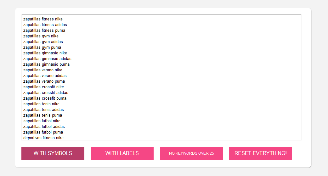 A diferencia de otras herramientas para buscar keywords, Keywordshitter no nos muestra ni el volumen de búsqueda, competencia ni la dificultad para posicionarla en las SERPs de Google, pero realmente te sorprenderá la cantidad de keywords relacionadas que puedes extraer.