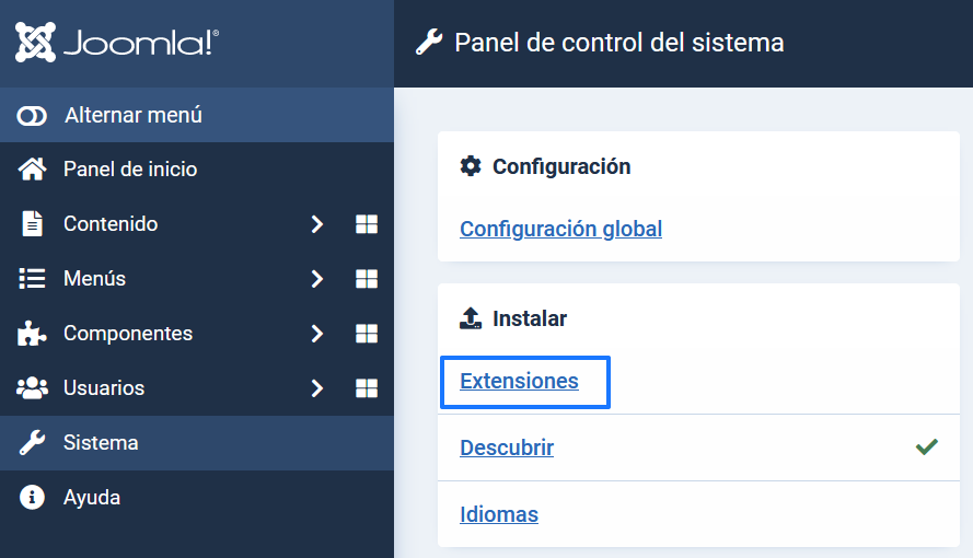 - Ve a la sección «Sistema» – «Instalar» – «Extensiones» en Joomla 4. Si tienes Joomla 3, ve a «Extensiones» – «Gestionar» – «Instalar».