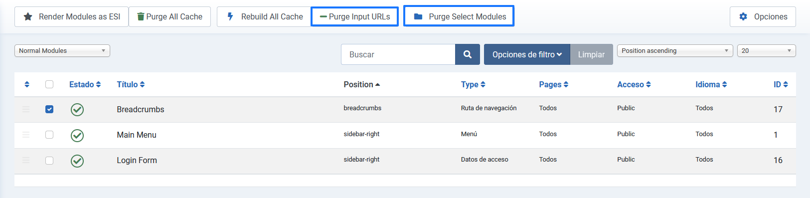 Si únicamente deseas eliminar la caché de una URL o de un módulo en concreto y no de toda la aplicación, tienes disponibles las opciones «Purge Input URLs» y «Purge Select Modules».