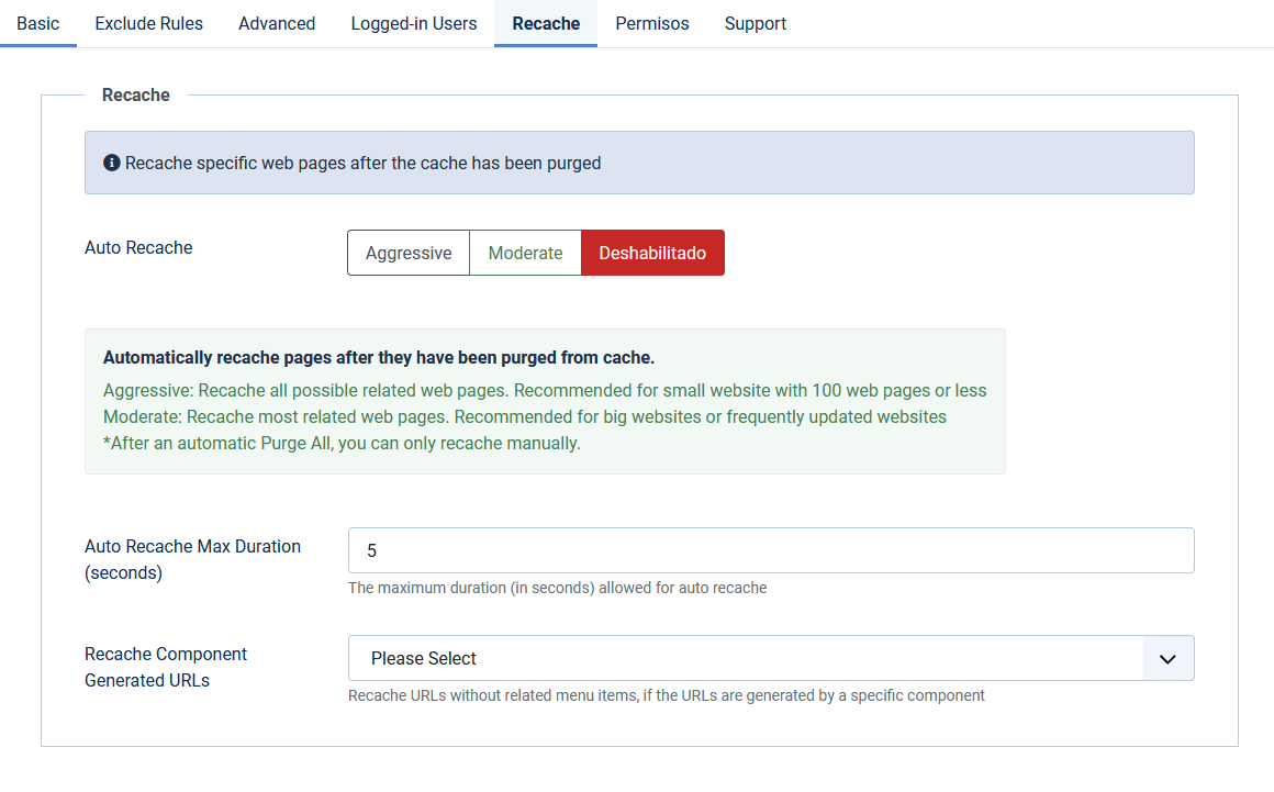 - Recache Component Generated URLs: si una URL es generada por un componente específico y no desde el menú, entonces podrás seleccionarlo para habilitar el almacenamiento en caché.