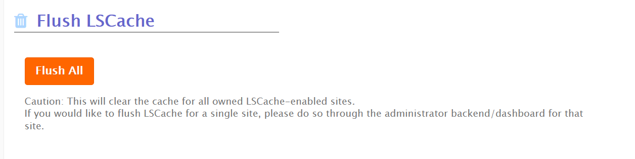 Luego, ve a la sección “Flush LSCache” y pulsa sobre “Flush All”. Eso sí, esto eliminaría la caché de todas las instalaciones de tu plan de alojamiento PrestaShop.