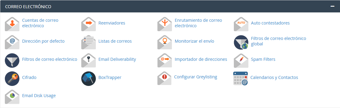 Desde esta sección podrás configurar todo lo necesario para utilizar cuentas de correo profesional con tu dominio. Por ejemplo, crear nuevas cuentas de correo electrónico, configurar reenviadores, añadir respuestas automáticas, establecer listas de correo o filtros de correo y spam.