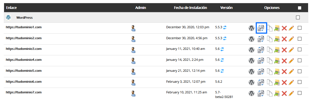 - Ahora se listarán todas las instalaciones de WordPress, Joomla, Moodle o cualquier otro CMS que hayas realizado con esta herramienta. Localiza la web sobre la que quieras realizar el staging y pulsa en el siguiente icono resaltado en color azul.