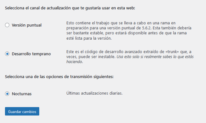 Ahora recarga la página y pulsa en «Solo Beta/RC» para probar la versión en desarrollo y vuelve a guardar los cambios.